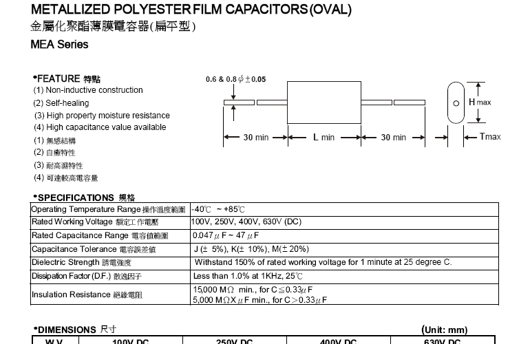 «臥式管狀型金屬化聚酯薄膜電容器 MET系列